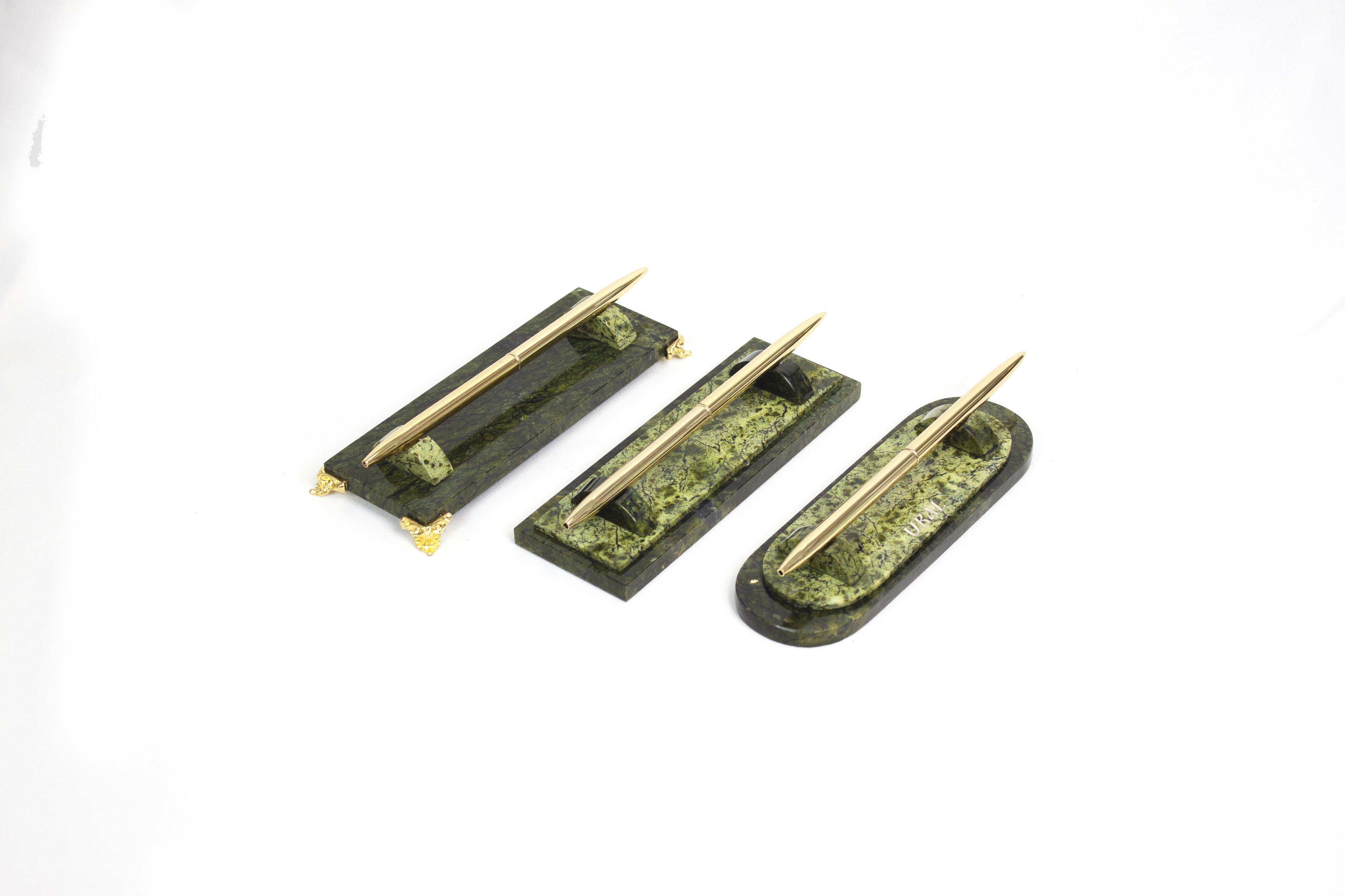 На фото представлены варианты подставок ручной работы из натурального змеевика.
