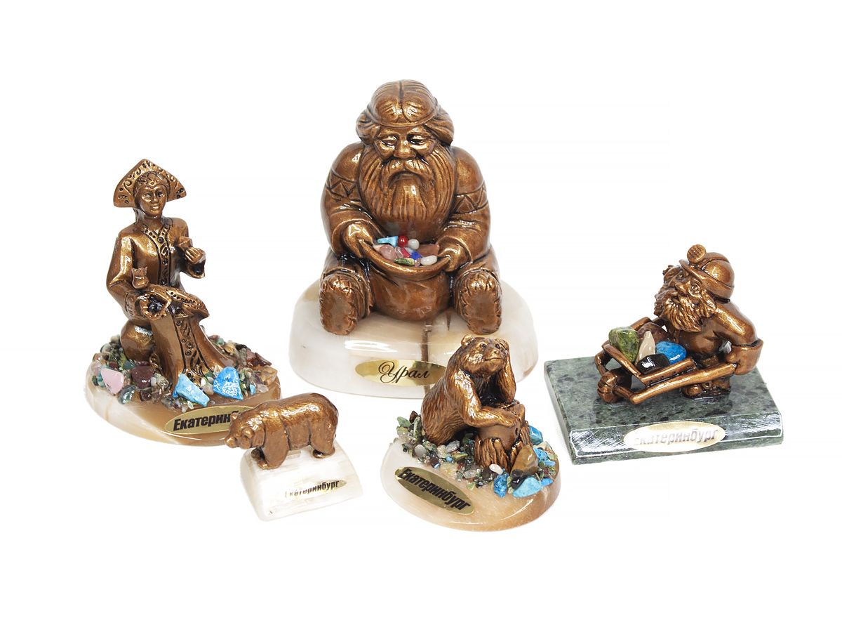 Широкий ассортимент настольных сувениров на подставках из натуральных уральских камней селенит и змеевик с россыпью самоцветов.