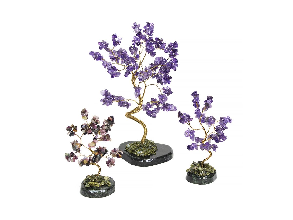 В ассортименте представлены деревья из различных натуральных камней высотой от 12 до 25 см.