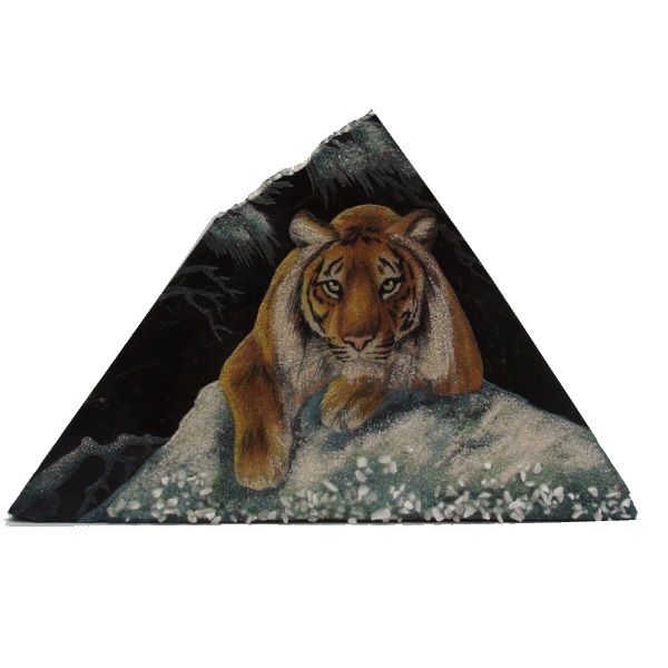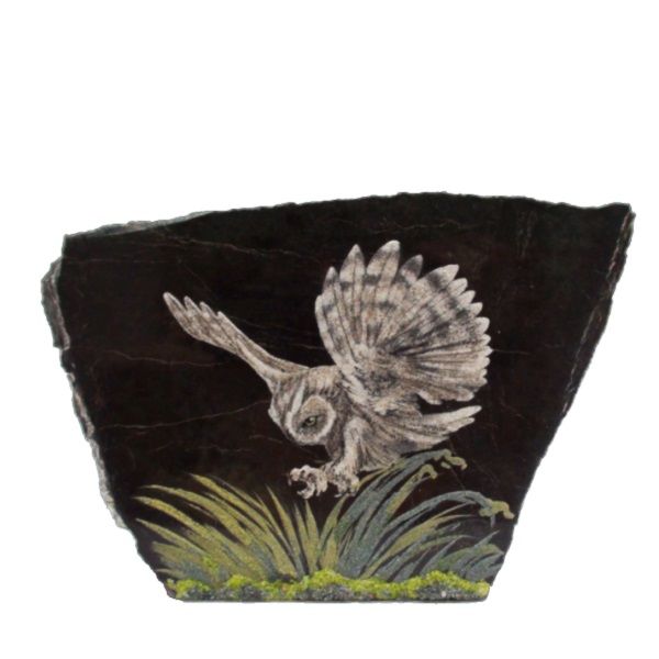 Спил камня змеевик с нанесением изображения способом насыпки разных оттенков натуральной каменной крошки.