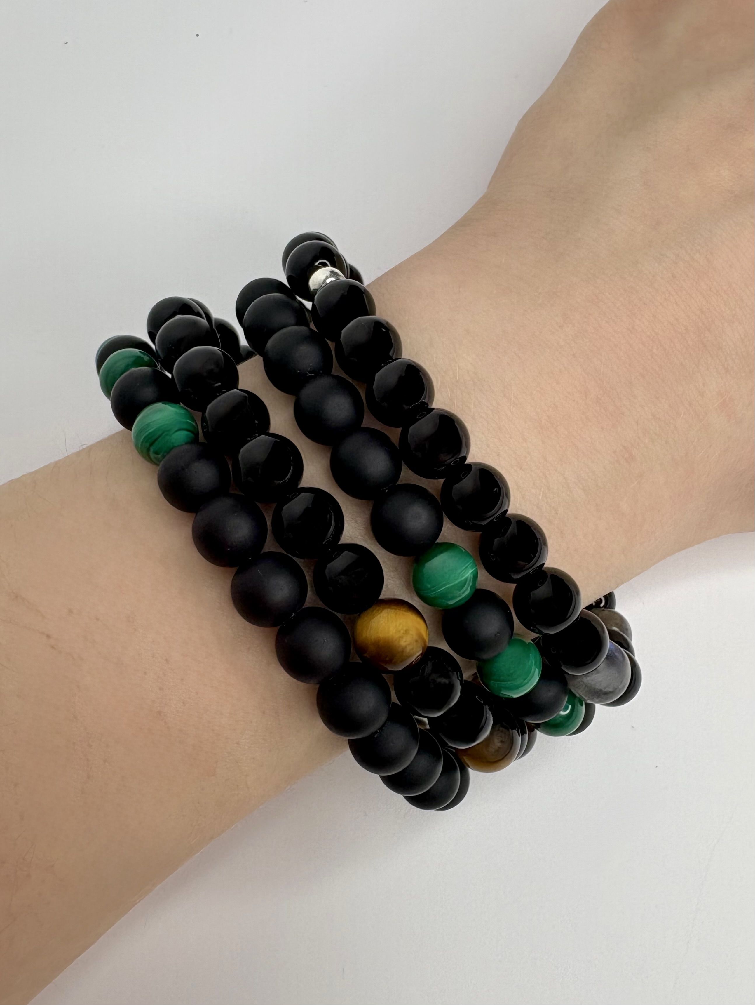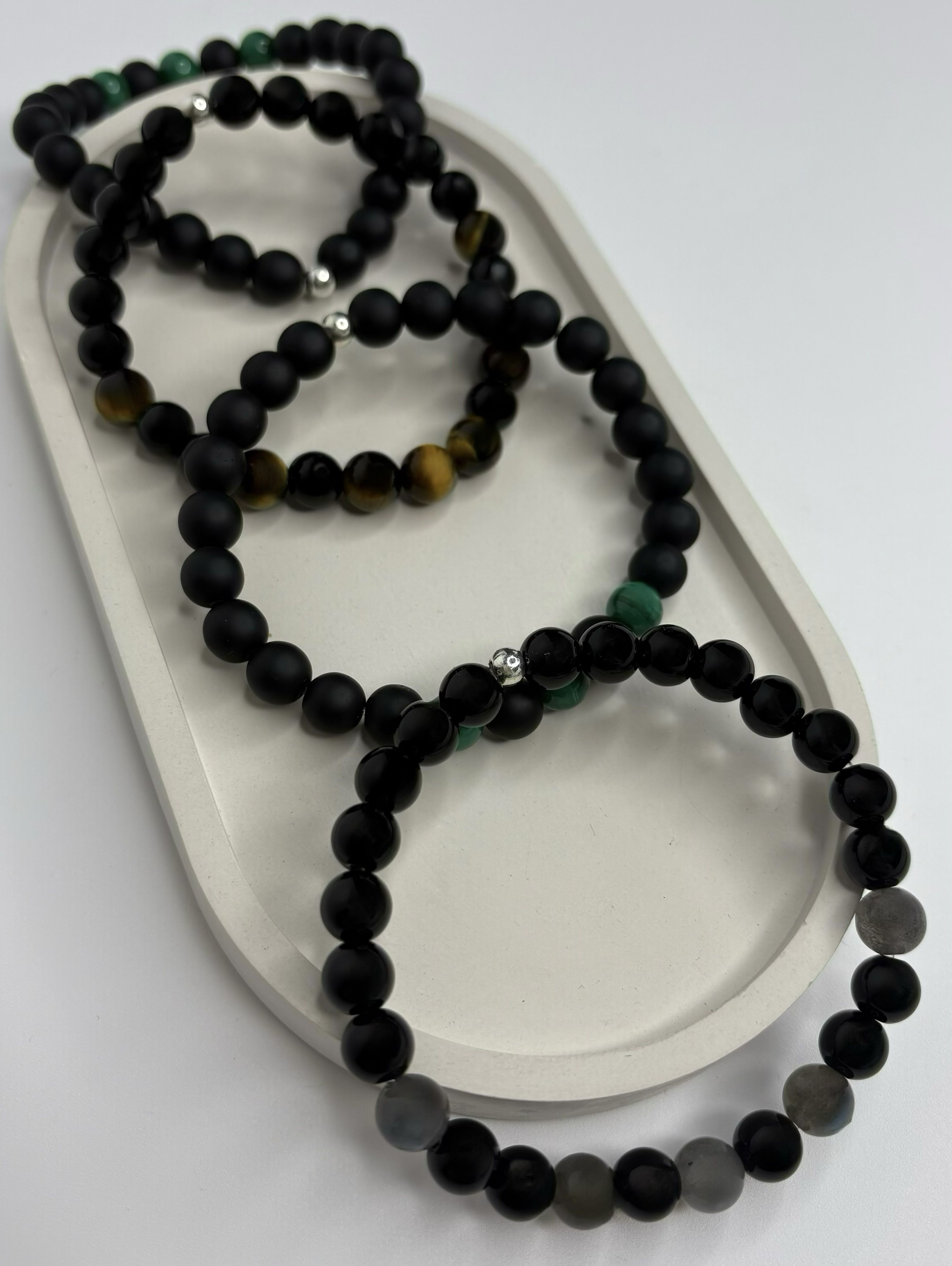 В ассортименте представлены мужские браслеты из различных натуральных камней таких как гематит, агат, шунгит, вулканическая лава, тигровый глаз, лазурит, малахит и др.