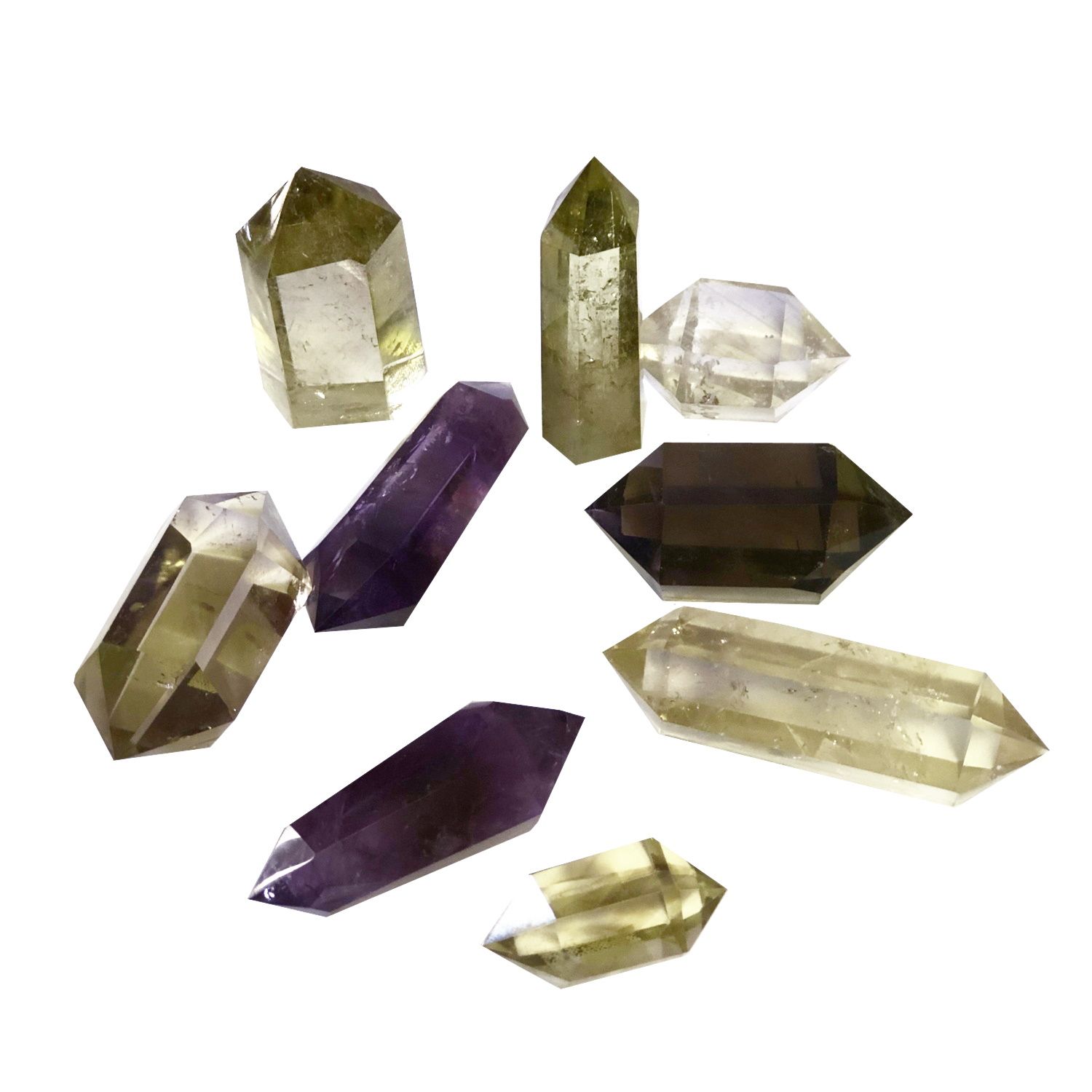 В ассортименте представлены кристаллы из различных натуральных камней, таких как горный хрусталь, аметист, раухтопаз, цитрин и др.