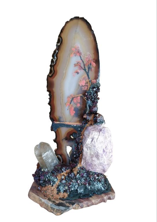 Материалы: коллекционный агат, измельченные минералы, основание лемезит, кристаллы горного хрусталя и дымчатого кварца, гранаты, яшма, слюда, крокоит и др.