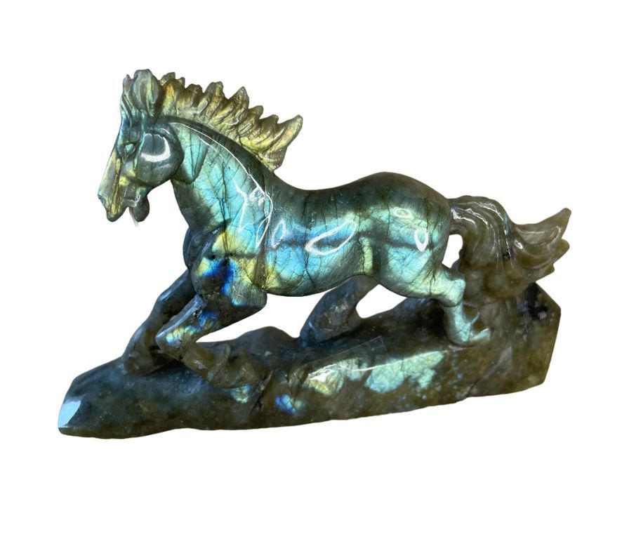 Фигура бегущей лошади из натурального камня с эффектом радужного сияния.