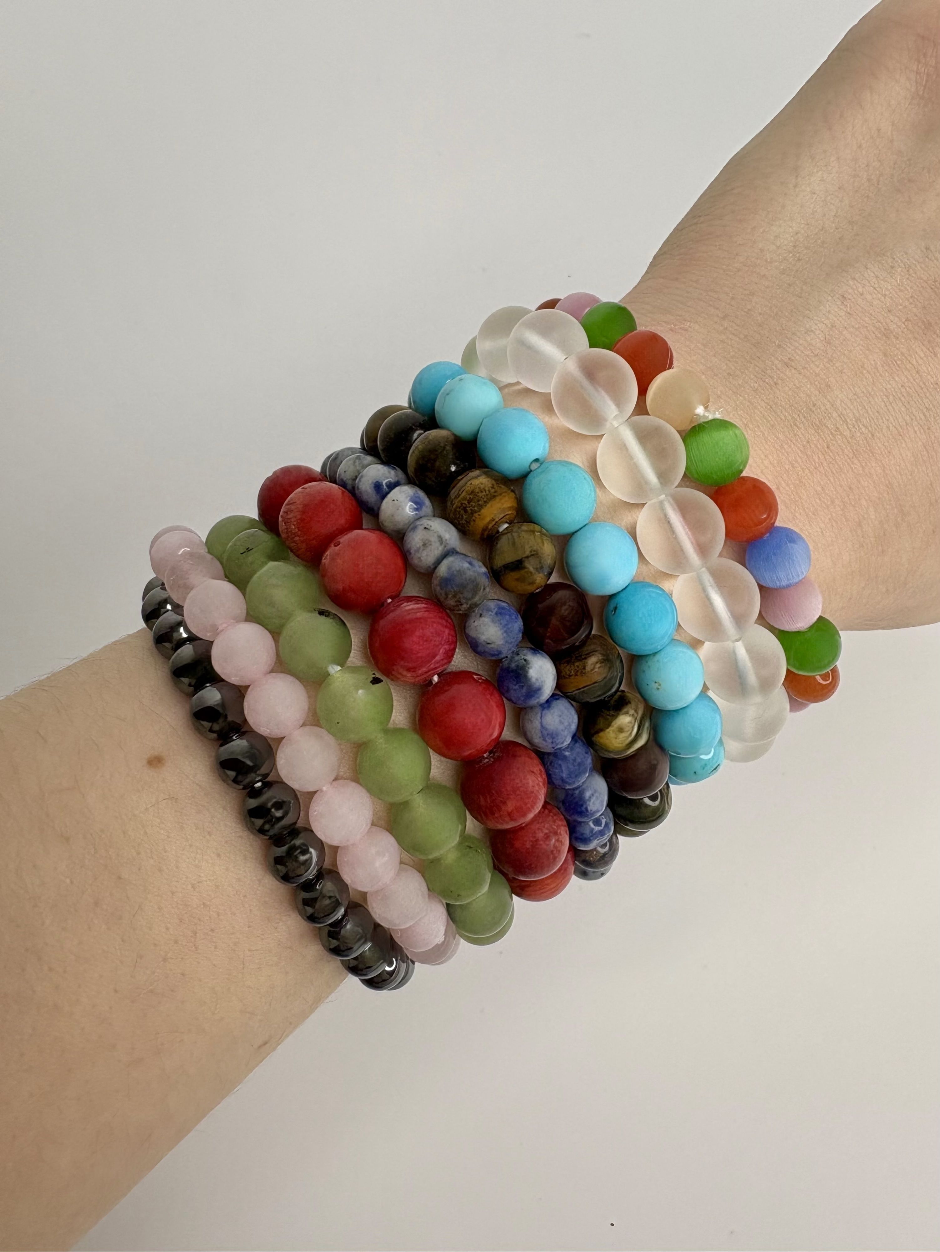 Для изготовления браслетов используются такие натуральные камни как розовый кварц, аметист, горный хрусталь, тигровый глаз, лазурит, яшма, родонит, оникс, змеевик, кварц, халцедон, авантюрин, туркенит, коралл, лунный камень, кошачий глаз, агат, гематит и др.