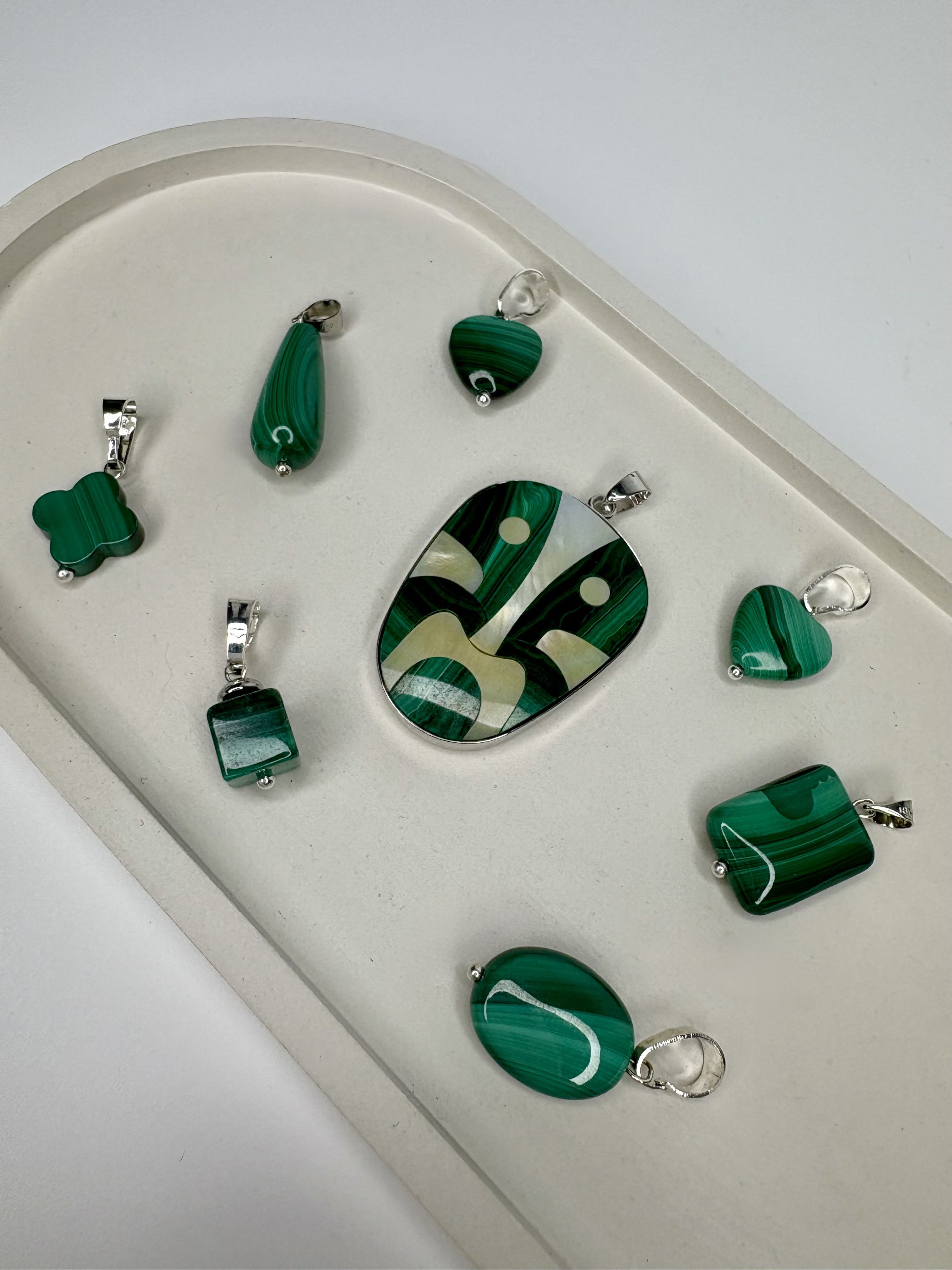 В ассортименте представлены кулоны из натурального малахита разных форм и размеров.