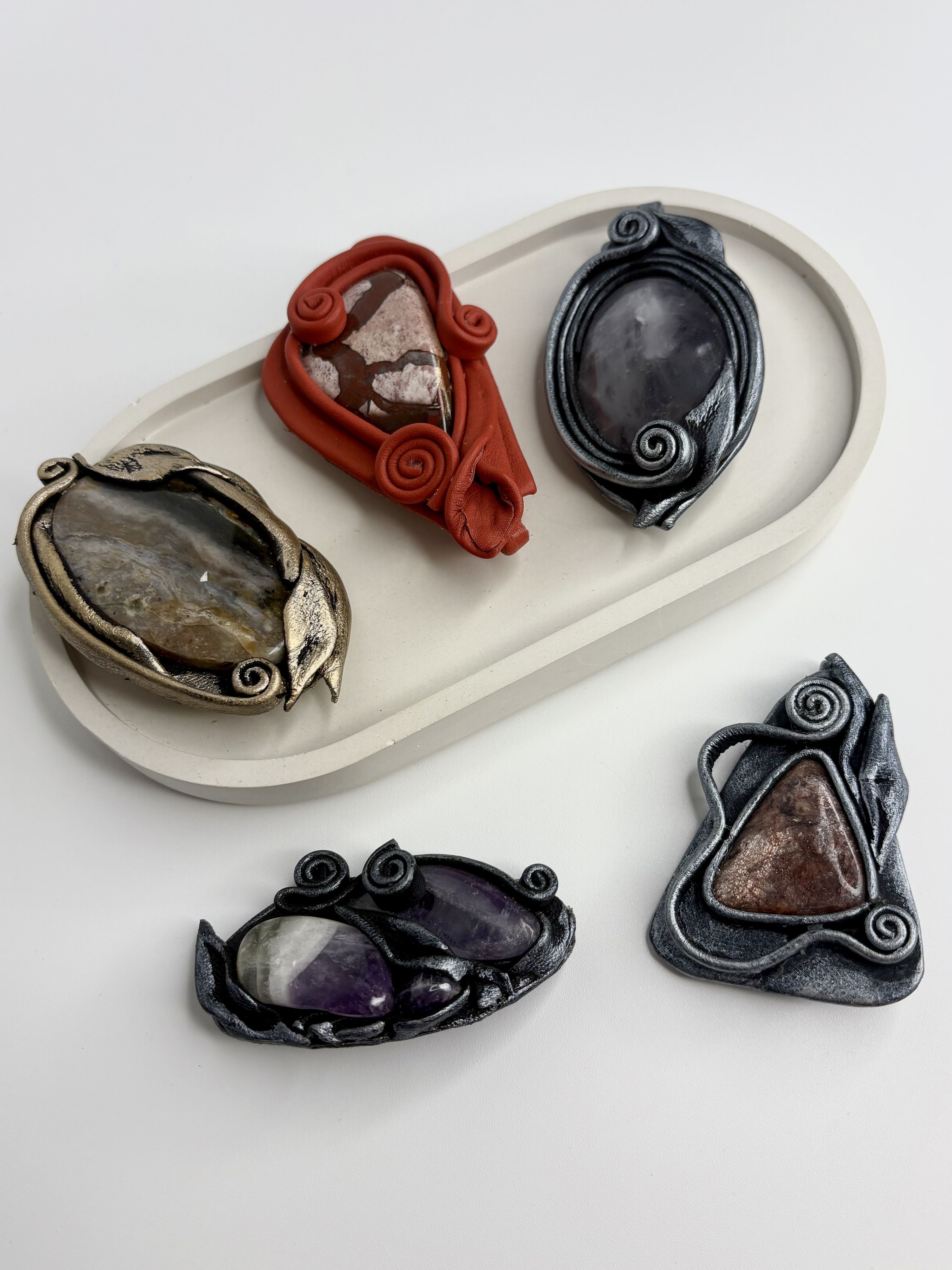 Материалы: натуральная кожа, природные камни - аметист, яшма, агат, лабрадорит, малахит, родонит и др.